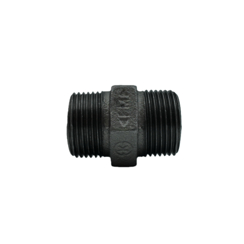 The Fig. 280 BSP black hex nipple is a malleable iron threaded pipe fitting designed to connect two female-threaded pipes or fittings of the same nominal size. Featuring male threads on both ends and a hexagonal section in the middle, it allows easy installation and removal using standard wrenches.